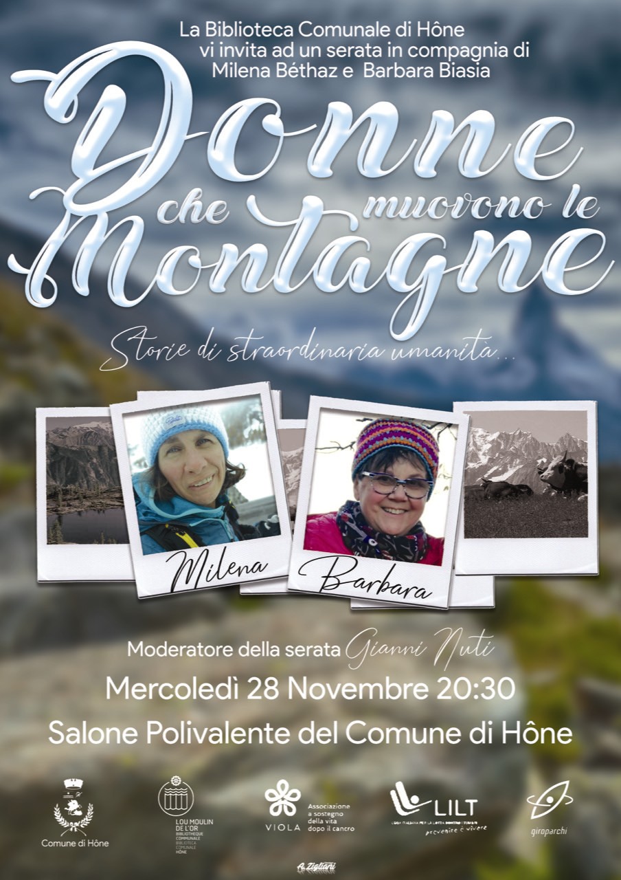 La Biblioteca di Hône vi invita ad una serata in compagnia di Milena Béthaz e Barbara Biasia: "DONNE CHE MUOVONO LE MONTAGNE".