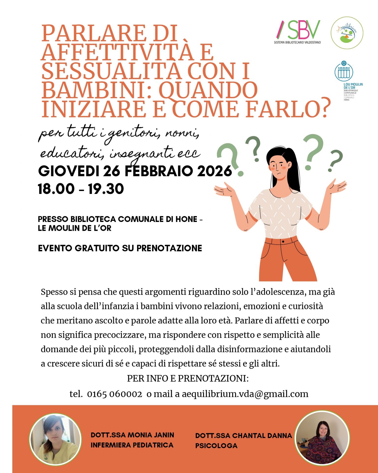 Incontro gratuito (su prenotazione) rivolto a genitori, nonni, educatori, insegnanti, ecc. presso la biblioteca comunale.