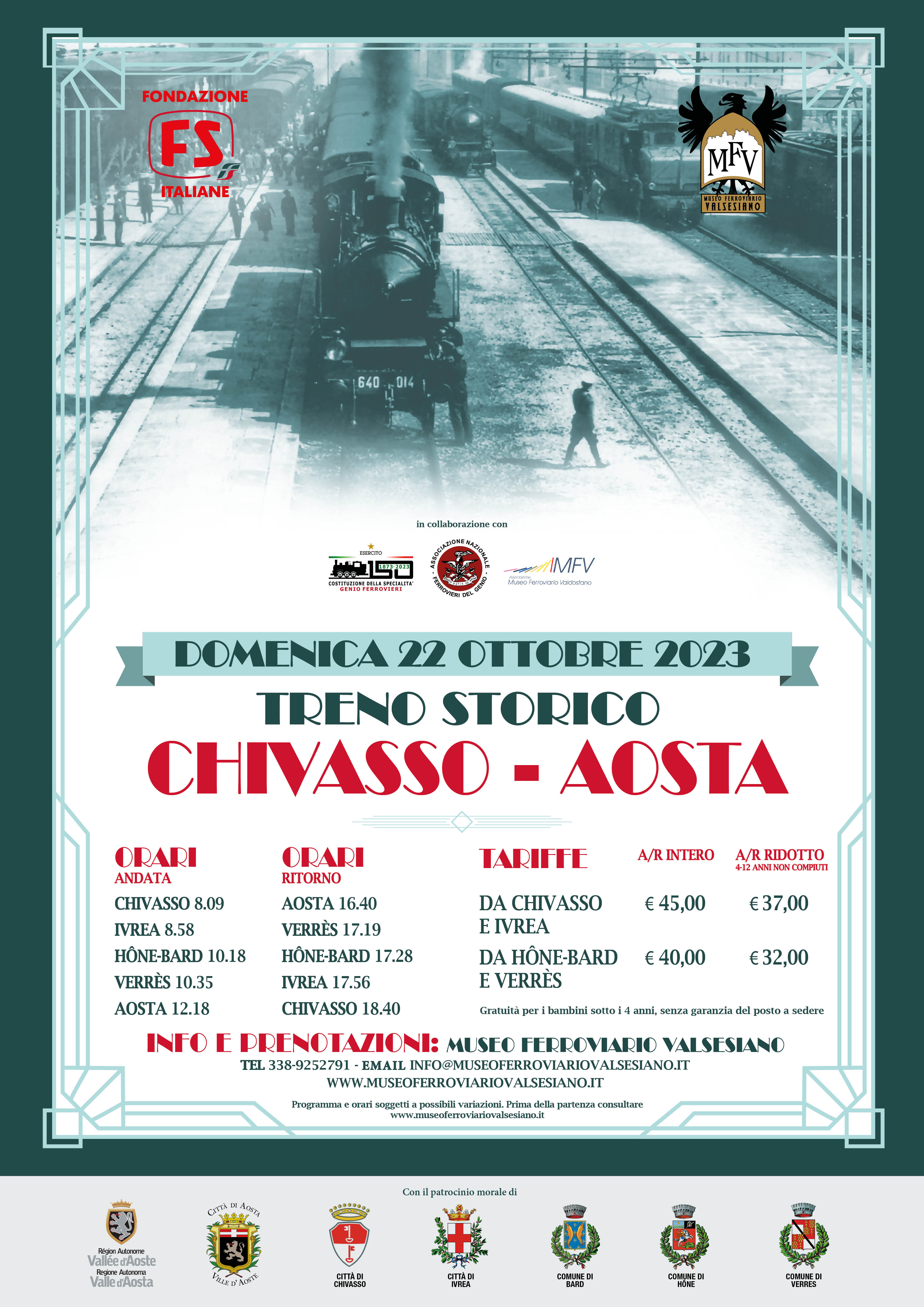Si pubblica la locandina definitiva del treno storico Chivasso-Aosta di domenica 22 ottobre 2023.