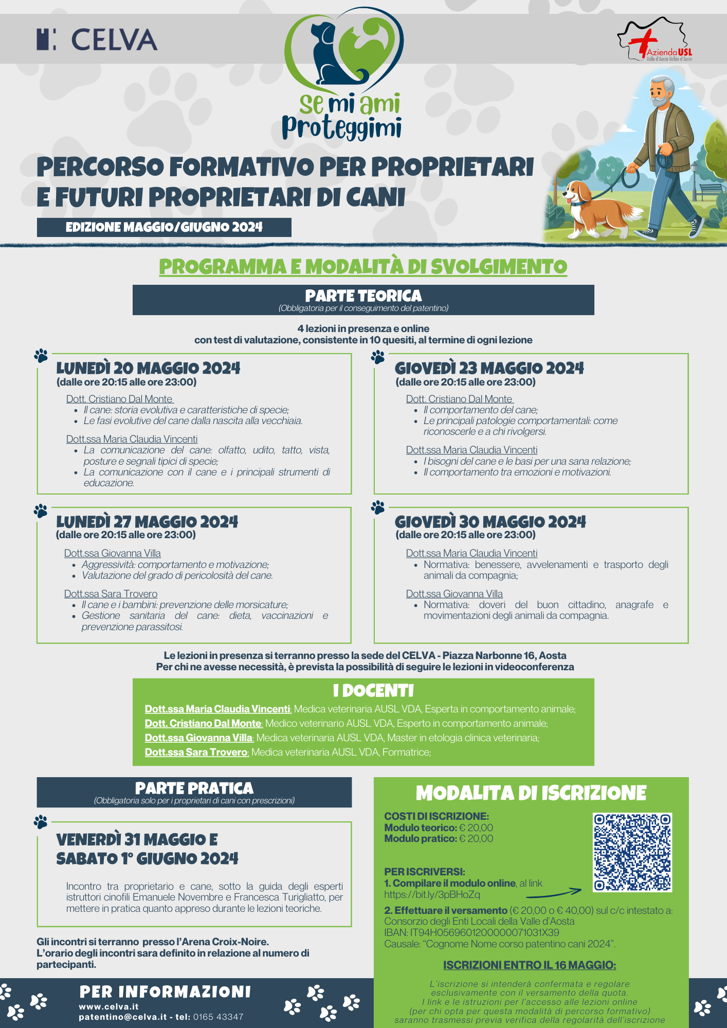 Il percorso formativo, organizzato da Celva e AUSL VdA, è aperto a tutti e prevede una parte teorica svolta in modalità webinar (obbligatoria per conseguire il patentino) e una parte pratica (obbligatoria solo per i proprietari di cani con prescrizioni, facoltativa per gli altri).
