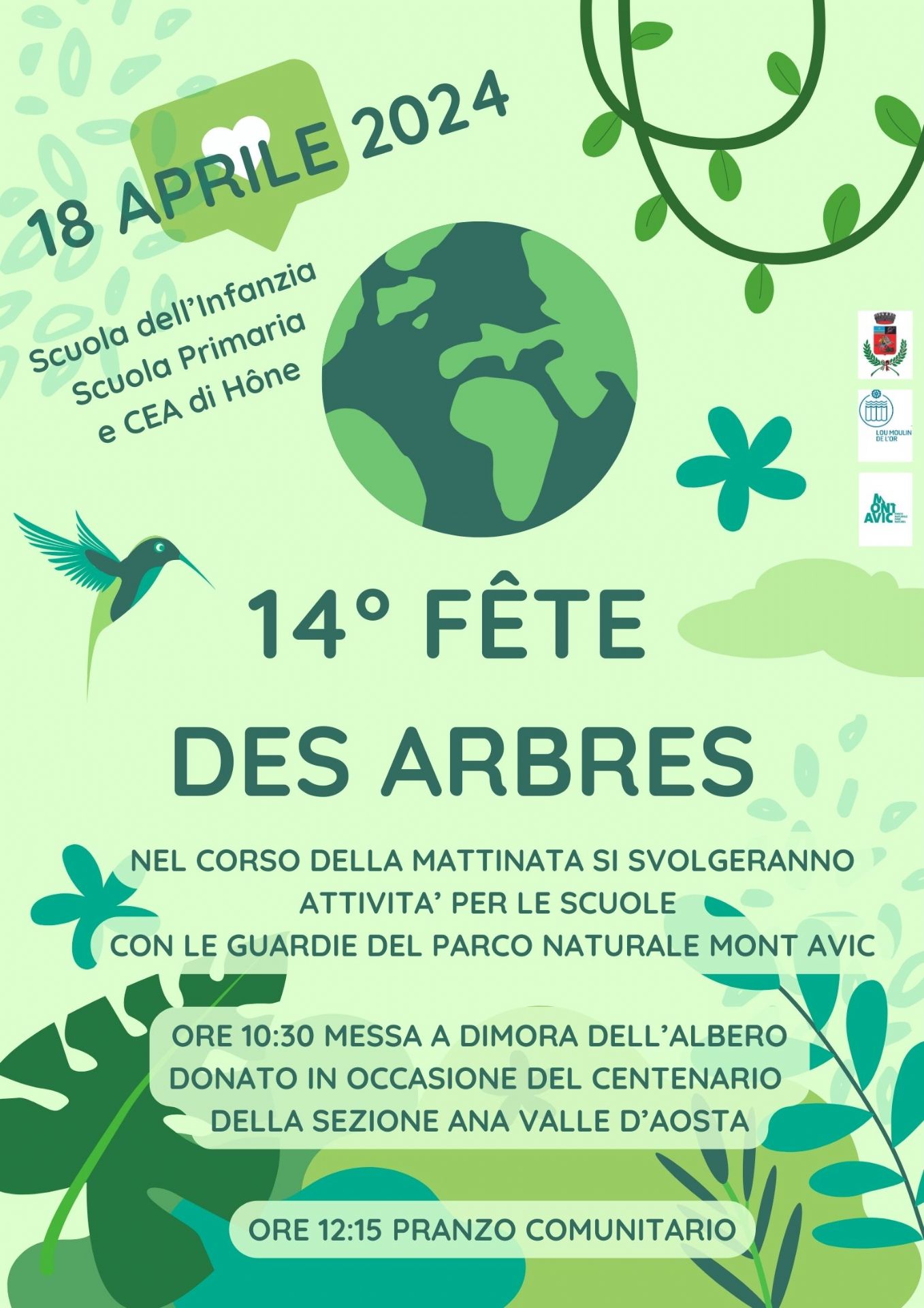 Il 18 aprile 2024 l'Amministrazione e la biblioteca comunale di Hône, in collaborazione con le guardie del Parco Naturale Mont Avic, organizzano la 14° Fête des arbres con la Scuola dell'Infanzia, la Scuola Primaria e il CEA di Hône.