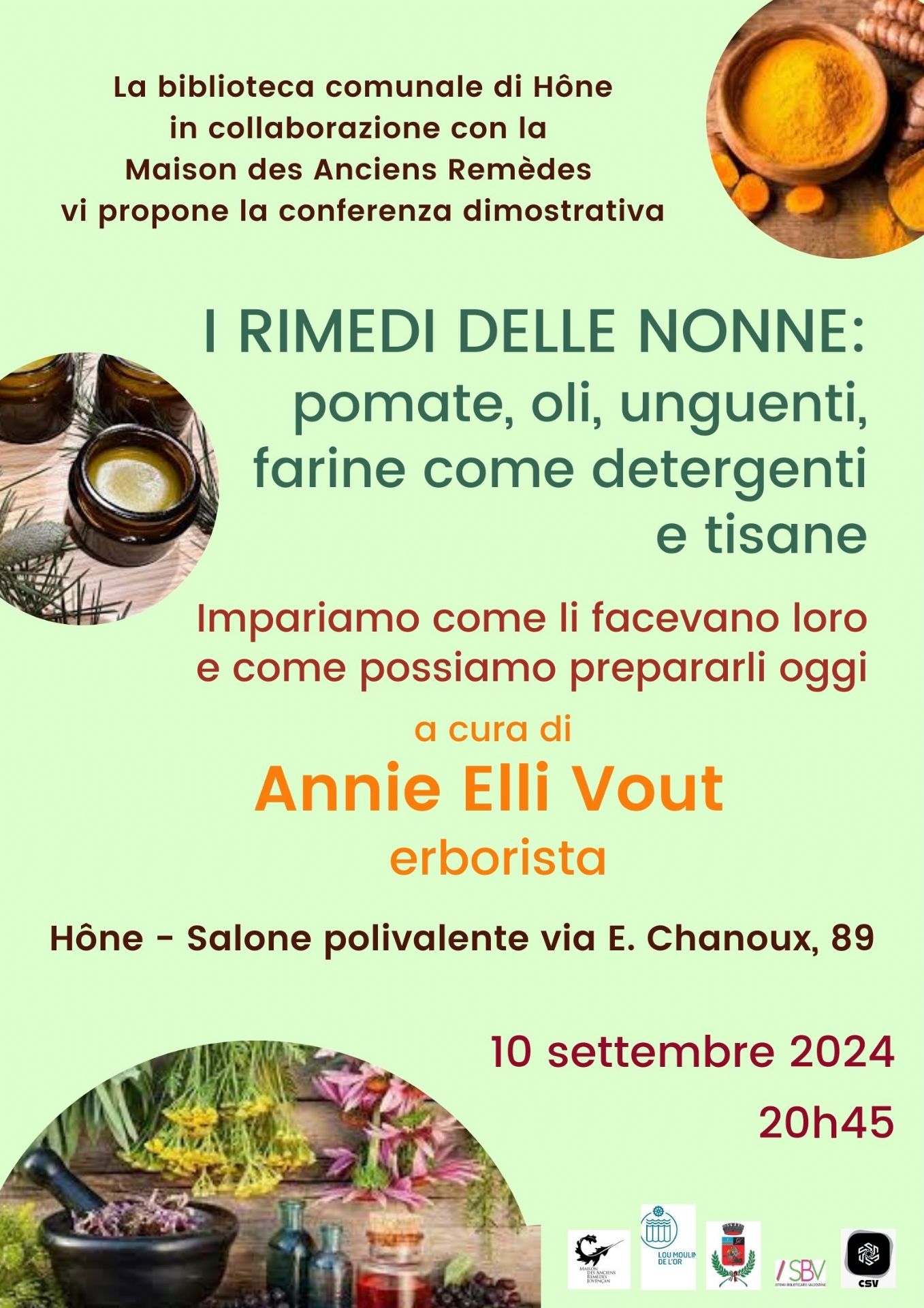 La biblioteca comunale di Hône in collaborazione con la Maison des Anciens Remèdes vi propone la conferenza dimostrativa dal titolo: I rimedi delle nonne: pomate, oli, unguenti, farine come detergenti e tisane. Impariamo come li facevano loro e come possiamo prepararli oggi a cura di Annie Elli Vout (erborista).