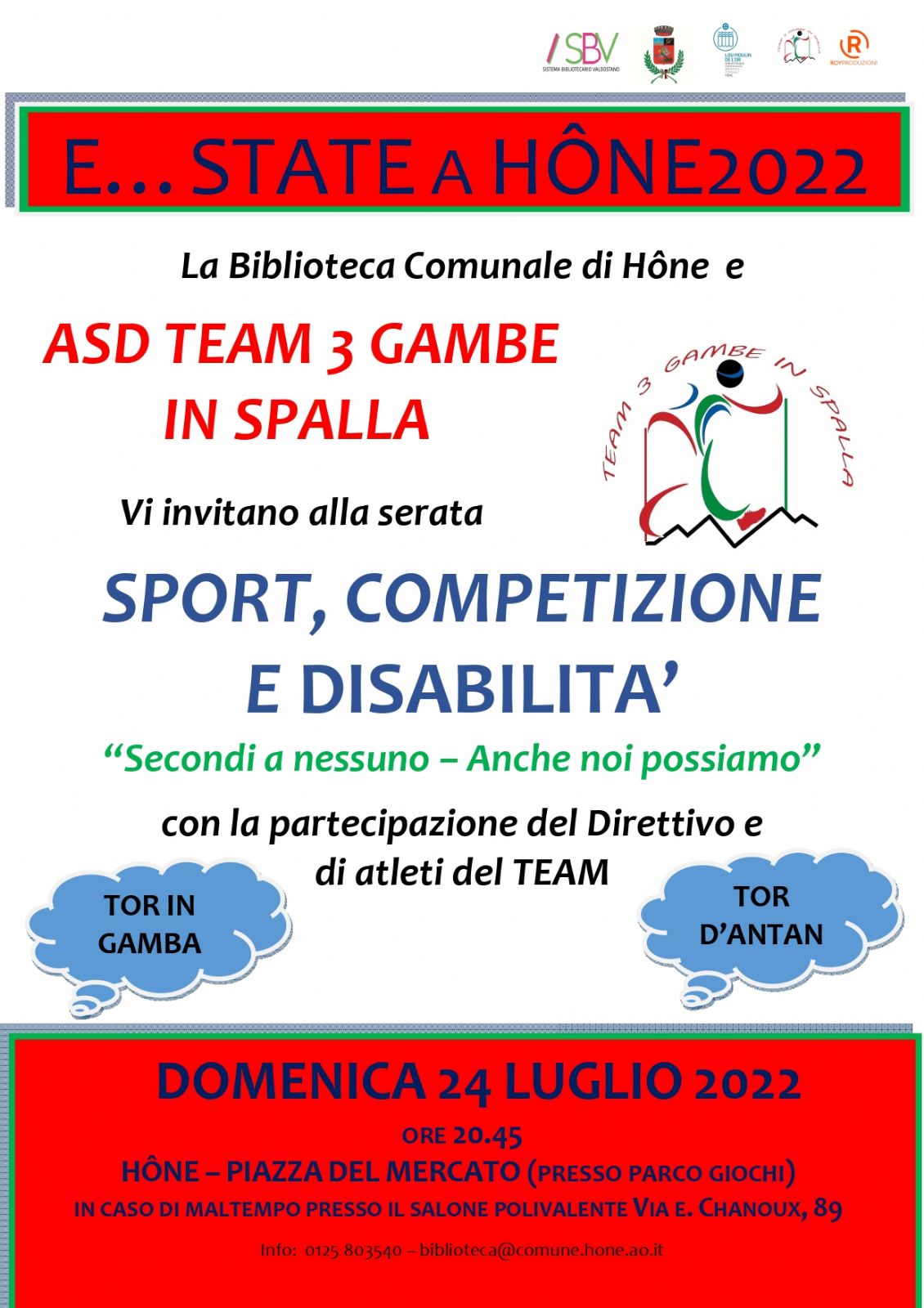 La biblioteca comunale e l'ASD TEAM 3 GAMBE IN SPALLA vi invitano alla serata che si terrà DOMENICA 24 LUGLIO 2022 per fa conoscere l'Associazione e per parlare di uno sport sempre più inclusivo.